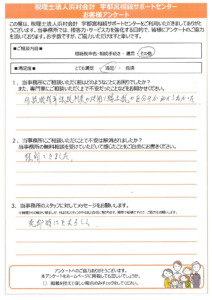 ご相談内容 その他 満足度 満足 当事務所にご相談いただく前はどのようなことでお困りでしたか?また、税理士にご相談いただく上で不安だったことなどをお聞かせください。 相続時精算課税制度の活用と、贈与税の区分けがわからなかった。 当事務所にご相談いただくことで不安は解消されましたか?当事務所にご依頼いただいて感じたことをご自由にお書きください。 理解できました。 当事務所のスタッフに対してメッセージをお願いします。 売却時にもよろしく。 相続に関する無料相談実施中! 相続手続きや相続税申告、遺言書作成など相続に関わるご相談は当事務所にお任せ下さい。 当事務所の税理士…